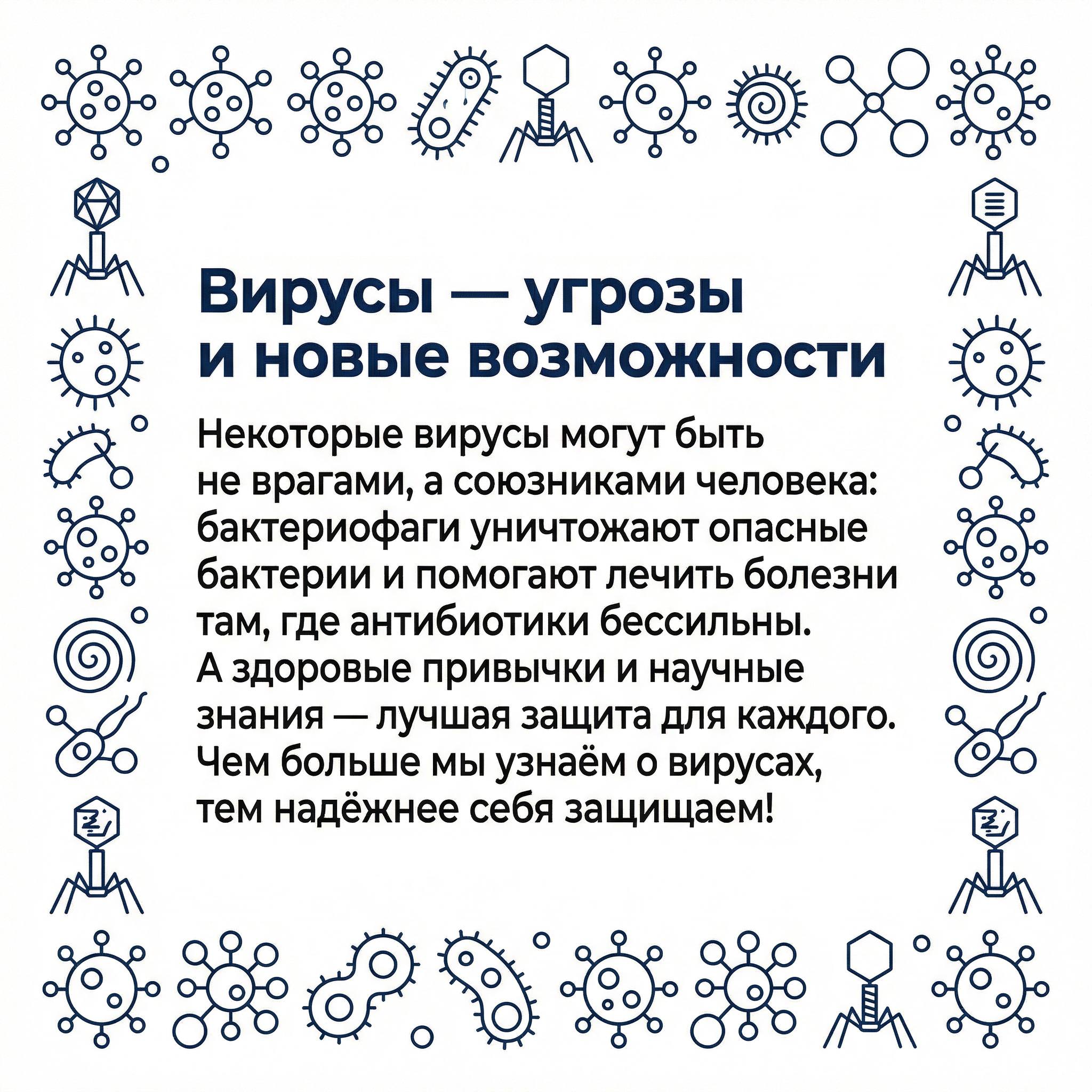 Вирусы — это микроорганизмы, которые не имеют клеточной структуры и способны существовать только внутри живых клеток хозяина. Они вызывают широкий спектр заболеваний, от банальной простуды до тяжелых инфекций, таких как грипп, корь, коронавирусная инфекция и многие другие. Особенность вирусов — их высокая изменчивость и способность быстро приспосабливаться к условиям среды.